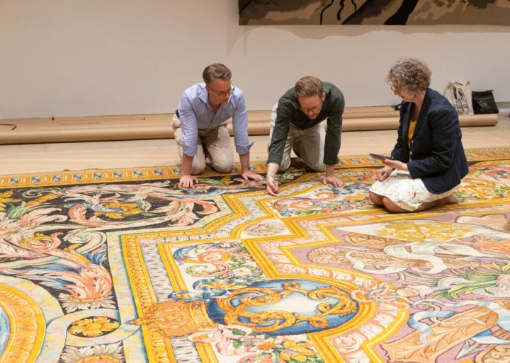 Wolf Burchard, Antonin Macé de Lepinay, and Elizabeth Cleland examine the Tapis Grande Galerie du Louvre, preserved by the Mobilier national in Paris, in 2023 (Photo by Justine Rossignol).