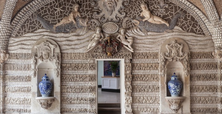 Grotto at Woburn Abbey, Bedfordshire. Originally a Cistercian abbey, Woburn became the seat of the Russell family and the Dukes of Bedford in the 16th century. The house was rebuilt in the early 17th century, with a second rebuilding undertaken in the mid-18th century to designs by Henry Flitcroft and John Sanderson. The Grotto is one of the few surviving 17th-century shellwork rooms in Britain.