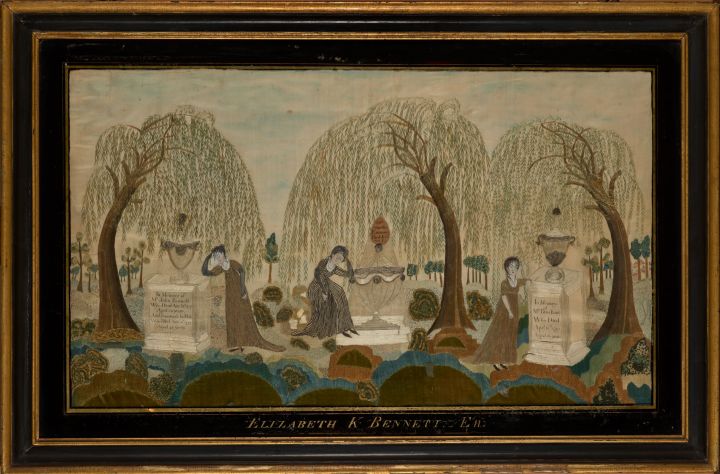 Elizabeth K. Bennett, Mourning Picture, 1801–07, polychrome silk embroidery, metallic threads, gouache and watercolor paints, plain-weave silk ground (Hartford: Wadsworth Atheneum, gift of Miss Jane W. Stone, 1938.236).