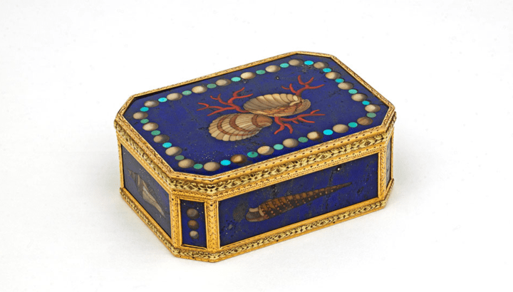 Rectangular, gold-mounted commessi di pietre dure (stone mosaics) snuffbox depicting shells and coral, Florence, Grand Ducal workshops, ca.1800