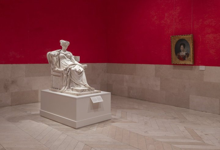 The second work, a posthumous marble sculpture by José Álvarez Cubero completed between 1826 and 1827, presents Maria Isabel as a Roman matron. Drawing on classical models such as Agrippina and filtered through Neoclassical aesthetics associated with artists like Canova, the sculpture transforms the queen into a timeless symbol of civic virtue and cultural legacy.