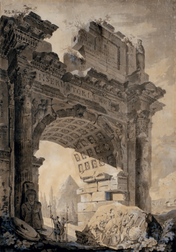 Hubert Robert, Arch of Septimius Severus, 1756; pen with grey and beige washes, 73 × 52 cm (Musée de Valence).