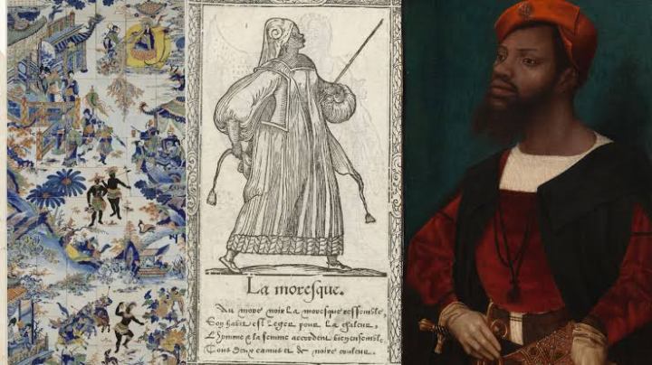 Anonymous (Delft), Tile panel with a Chinese landscape, ca. 1700; François Desprez, Illustration from Recueil de la diversité des habits‘, 1562; Jan Jansz Mostaert, Portrait of an African Man (Christophle le More?), 1525–30 (Rijksmuseum, Amsterdam).