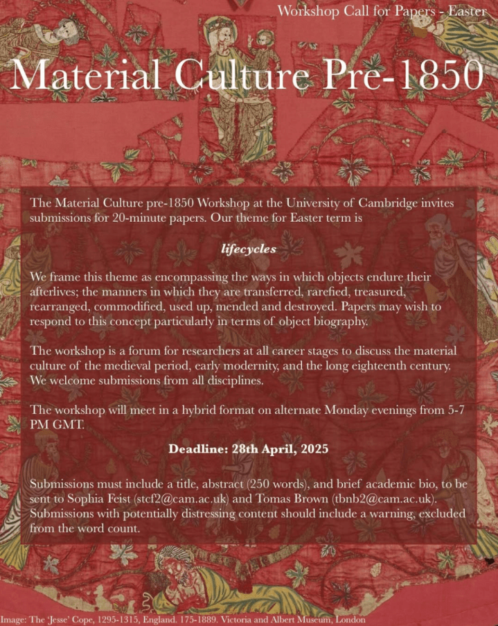The Material Culture pre-1850 Workshop at the University of Cambridge invites submissions for 20-minute papers. Our theme for Easter term is Lifecycles, which we frame as encompassing the ways in which objects endure their afterlives; the manners in which they are transferred, rarefied, treasured, rearranged, commodified, used up, mended and destroyed. Papers may wish to respond to this concept particularly in terms of object biography.