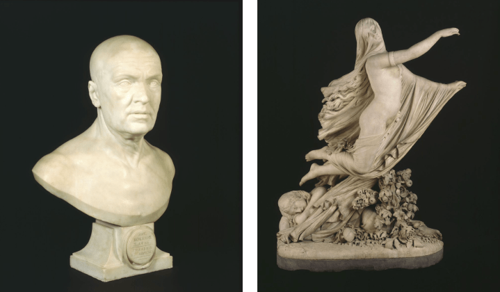 Left: Joseph Wilton, Dr Antonio Cocchi, 1755 (London: V&A: A.9‐1966). Right: Raffaele Monti, The Sleep of Sorrow and the Dream of Joy, 1861 (London: V&A: A.3-1964).