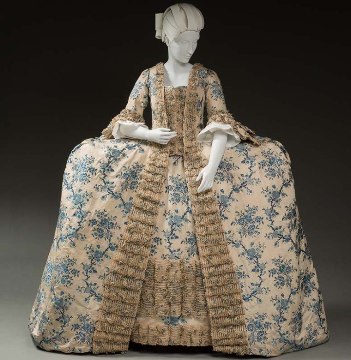 Formal dress (robe à la Française), 1765–70, French or Dutch, brocaded silk with knotted silk fringe and linen lining (Historic Deerfield, HD F.355).