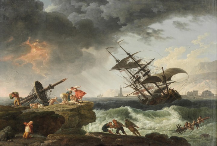 Claude-Joseph Vernet, Shipwreck on a Rocky Coast, 1775, oil on canvas, 74 × 108 cm (Private Collection). The work and its pendant, Harbour Scene at Sunset, are identified by Yuriko Jackall as paintings acquired directly from the artist by François-Marie Ménage de Pressigny, who likely commissioned The Swing by Fragonard. In contrast to the latter, which in 1794 was valued at 400 livres, the two paintings by Vernet were valued at 4,000 livres—the most valuable paintings owned by Ménage de Pressigny.