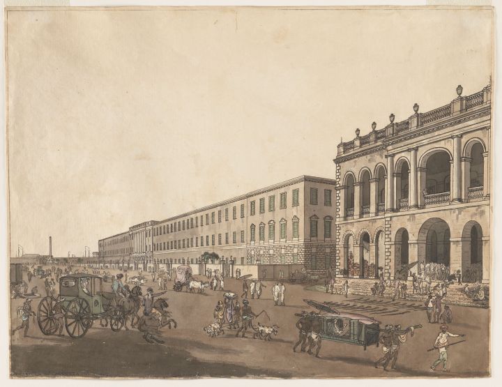 Thomas Daniell, The Old Court House and Writers’ Building, 1786, hand-coloured etching, 403 × 524 mm
