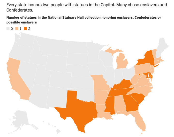 All 11 states that joined the Confederacy have at least one statue depicting an enslaver or Confederate. But the homages to enslavers are by no means restricted to these states: Except for New Hampshire, all of the original 13 states have statues depicting enslavers or possible enslavers.